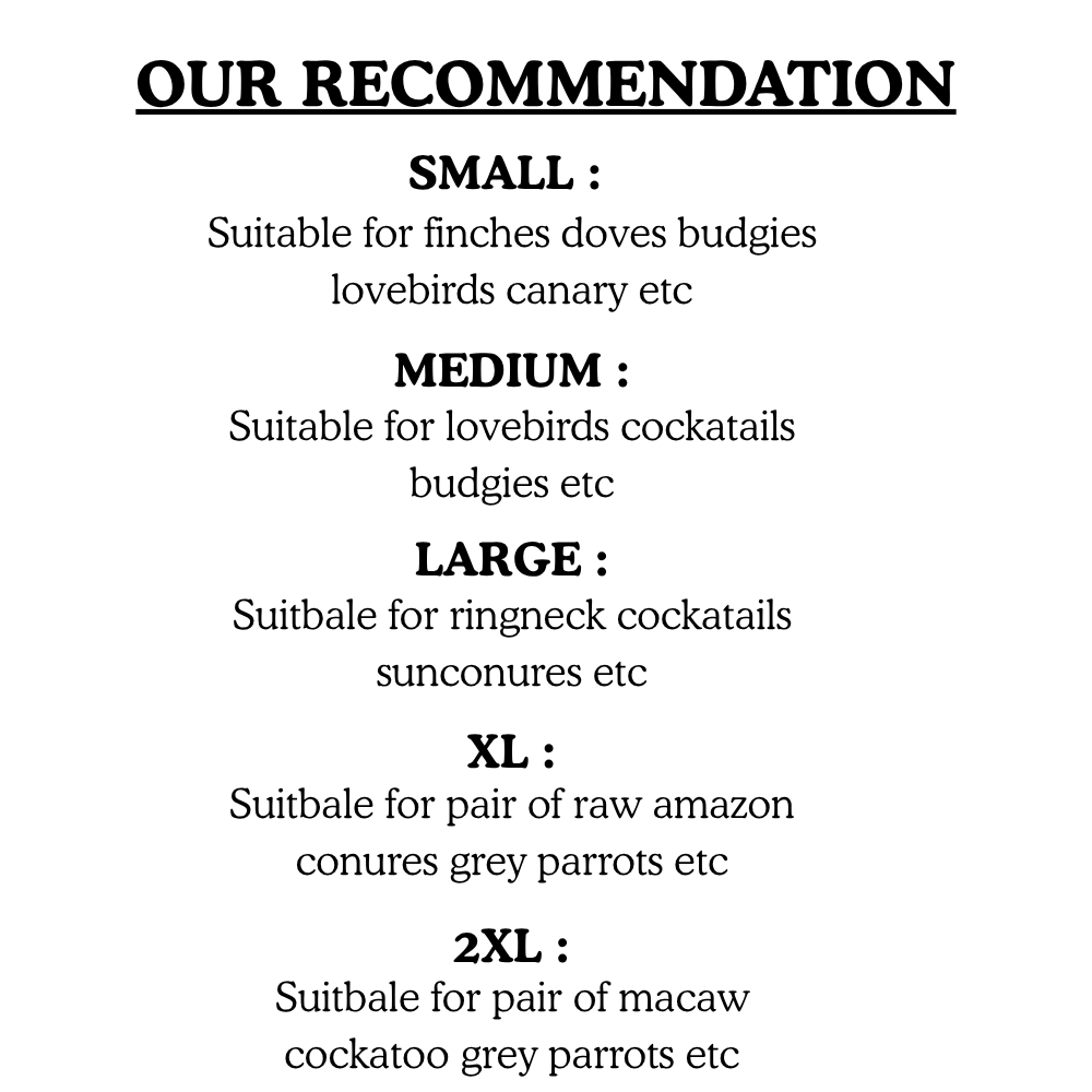 - Sizes for Everyone: Chahay chota sa Budgie ho ya bada Macaw, hamare paas har bird ke liye sahi size maujood hai.